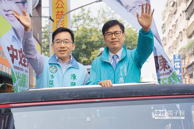 “綠委”陳其邁(右)17日為陳致中(左)掃街拜票。(圖片來源:臺灣《中時電子報》)
