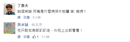 得知消息的臺灣網友對此罵翻:“貪污犯保外就醫還可以參與政治活動,全世界也只有貪扁一家可以了”“又加深對這對父子的厭惡感!”“臺灣人的包容力是世界第一名,這種國際認證的貪污犯家庭,還能在這個社會順風順水,真不簡單!”“身體很好,抓回去關吧!”“讓他上,讓全世界看看我們綠到發青的選民”“看到你,票就投不下去了!”“讓我們見識一下,什么叫做嫖妓后,還能順利成為民代的奇跡吧!”
