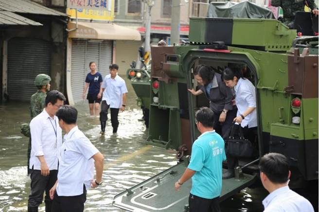 蔡英文搭云豹裝甲車(chē)進(jìn)入尚在淹水的布袋鎮(zhèn)永安里勘災(zāi)。(圖片來(lái)源:臺(tái)灣“中時(shí)電子報(bào)”)