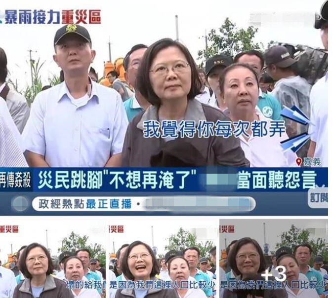 不過(guò),這還沒(méi)完,在聆聽(tīng)災(zāi)民抱怨時(shí),蔡英文竟整個(gè)笑噴,再度引發(fā)爭(zhēng)議。據(jù)臺(tái)媒報(bào)道,一位女性災(zāi)民當(dāng)場(chǎng)向蔡英文抱怨抽水機(jī)問(wèn)題“我覺(jué)得你每次都用壞的給我們,是不是因?yàn)槲覀內(nèi)丝诒容^少”,沒(méi)想到蔡英文聽(tīng)完竟當(dāng)場(chǎng)噴笑出來(lái),之后似乎覺(jué)得不妥趕緊拿東西遮嘴,隨后又笑嘻嘻地說(shuō)“下次給你一個(gè)新的啦!”