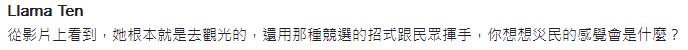 國(guó)民黨發(fā)言人洪孟楷在Facebook痛批這是“史上最傲慢勘災(zāi)”,形容蔡英文像是“花車(chē)游行上的選美小姐”。還有民眾火大開(kāi)嗆,“勘災(zāi)?連下來(lái)泡在水里做做秀都不肯,搭云豹來(lái)就算了,裝一下沉痛、裝一下反省可以不可以?面帶微笑是哪招?還給我揮手!你是來(lái)謝票還是來(lái)掃街?你確定你沒(méi)有跑錯(cuò)棚?”