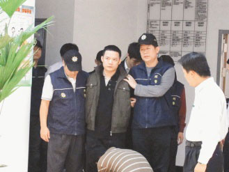 吳東威(中)等人涉嫌放高利貸,為追討14萬元債務逼死陳綾蕙,昨天被警方逮捕。圖片來源:臺灣《聯合報》