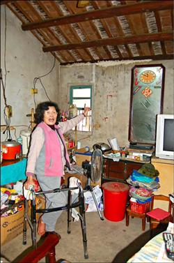 新埔鎮民謝劉玉珍指著被修補過的墻面