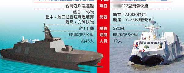 據不愿透露姓名的臺當局“國防部”主管作戰官員表示,雄三導彈射程三百公里,臺灣海峽僅兩百至三百公里寬,未來此型近岸巡邏艦只要部署在海峽附近巡弋,即可達到封鎖臺灣海峽的戰略嚇阻作用。該艦噸位數約一千噸,戰時可在一般漁港進行躲避及補給作業,在戰場的生存率上,比拉法葉艦、成功級艦等大型艦更具優勢。