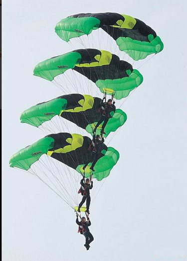 臺灣陸軍空降訓練中心昨在屏東空降場展現訓練成果,“神龍小組”在高空表演“踩肩式迭傘組合”,并首次展示動力飛行傘的編隊飛行,動力飛行傘利用背負的飛行傘引擎,可有效執行敵后空中突擊、偵搜等任務。16位女姓士官兵也進行了跳傘訓練,展現巾幗不讓須眉精神。