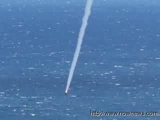 臺軍導彈從發射箱射出后由于燃燒不完全,直接墜落海面。圖片來源:臺灣“今日新聞網”