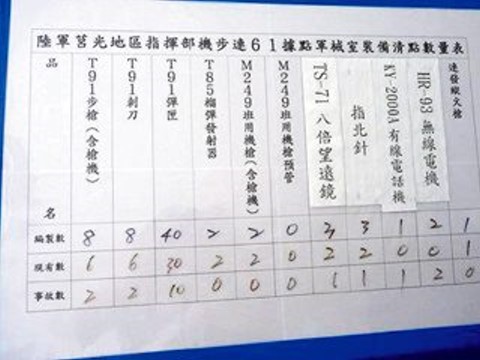 據報道,臺軍方嚴禁攜帶照相手機進入營區內,但日前卻有一張馬祖陸軍莒光地區指揮部61據點的武器清點表在網絡上流傳,照片中包括武器配備數量與妥善率一覽無遺,引發網友討論。