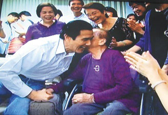 馬英九探視屏東102歲人瑞劉成妹,劉成妹對馬英九說“你給我愛一次!”馬英九親了阿婆臉頰,還獻唱兒歌“妹妹背著洋娃娃”,阿婆開心地說:“看到你我真的好福氣!”(圖片來源:聯合報)