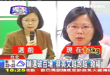 蔡英文本來就不是瘦尖臉形,現(xiàn)在看起來,雙頰下巴更成了一道圓弧線,體重增加3公斤,賣力抬轎輔選,怎么會越抬,自己越福態(tài)?蔡英文稱,“因為行程比較緊湊,吃的地方都不定時,也不知道在哪里,所以每一頓都要吃得很飽。”