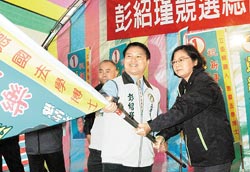民進(jìn)黨候選人彭紹瑾溪南競(jìng)選總部昨日成立,蔡英文站臺(tái)助勢(shì)并授旗。(圖:臺(tái)灣《中國(guó)時(shí)報(bào)》)