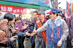 馬英九昨天下午陪同新竹縣“立委”補(bǔ)選候選人鄭永堂在湖口冒雨掃街,親切地和民眾握手。(圖:臺(tái)灣《中國(guó)時(shí)報(bào)》)