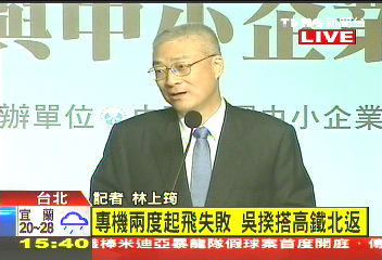 據報道,吳敦義上午到高雄出席活動,傳出專機發生問題,改搭高鐵回臺北的吳敦義一行人,下午終于出現在中小企業的會面行程。吳敦義一開頭,先述說自己的“專機驚魂”經過。他說:“在小港機場的那部飛機,因為起飛的速度不夠,所以虛驚過兩次,所以機長來報告我說,以安全為重,所以后來改搭高鐵回來。”