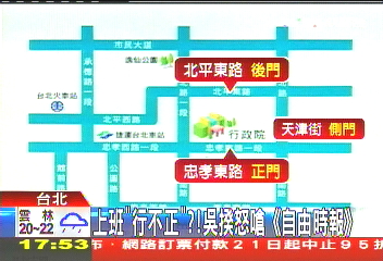 據悉,臺灣“行政院”共有有五個門,分別為右前門、左前門,兩邊側門以及后門。親綠的《自由時報》的報道稱,吳敦義上班時不敢走大門,都是從側門入院,是個“行不正的院長”。