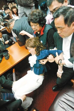 臺灣“立法院教育及文化委員會”上午排定審查大陸學(xué)生赴臺學(xué)習(xí)相關(guān)法案,會議主席趙麗云因為堅持要主持會議,藍(lán)綠雙方陣營從主席臺不斷拉扯轉(zhuǎn)移到備詢官員席,現(xiàn)場人員擁擠,趙麗云疑似被人勒住脖子,短暫缺氧而昏倒,最后在同黨籍女民代陪同下,搭出租車赴臺大醫(yī)院就醫(yī)。