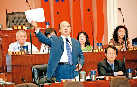 臺中市日前發生槍擊案竟有員警在場,市長胡志強“消息不靈”,昨日在議會現場高舉報告說“我今天才拿到。”圖片來源:臺灣《中國時報》