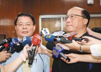 官警在槍擊現(xiàn)場,臺中市長胡志強(qiáng)(右)昨天上午表示,他第一時間不知情,并指警方報告疑點(diǎn)重重,他不愿為警方懲處背書;晚間,胡木源(左)去職后,胡志強(qiáng)重申“看完報告,局長不異動都難。”圖片來源:臺灣《聯(lián)合報》