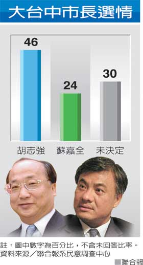 臺中市四名官警出現在黑道角頭被槍擊死亡現場,引發社會嘩然,對年底大臺中市長選情的沖擊備受關注。選情調查發現,國民黨提名的胡志強聲勢仍居上風,目前獲得46%選民支持,民進黨蘇嘉全支持率24%,30%未決定。