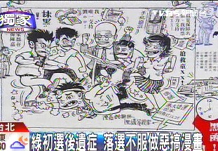 據臺灣TVBS電視臺報道,民進黨臺北市議員提名已經完成民調初選,但初選造成的傷痕余波蕩漾,被擠掉的現任議員陳嘉銘不服,質疑初選公平性,制作惡搞漫畫丑化同黨其它參選人,畫中人火爆怒目、拳腳相向,就連“天王”蘇貞昌也被畫成香腸嘴跟大鼻孔。