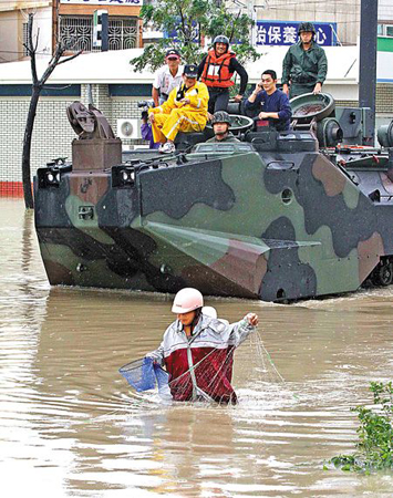 臺軍方出動水陸兩棲戰車至高雄市楠梓區緊急救援,有些民眾則在水里悠閑地捕魚。 來源:臺灣《中國時報》