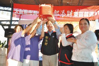 國民黨大臺南市長候選人郭添財(中)10日成立東區競選分部,支持者送上包子,祝他包中。圖片來源:臺灣《聯合報》
