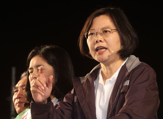 民進(jìn)黨新北市長(zhǎng)候選人蔡英文(右)24日晚間出席臺(tái)北縣永和造勢(shì)晚會(huì),向選民發(fā)表個(gè)人政見,爭(zhēng)取支持。圖片來(lái)源:“中央社”