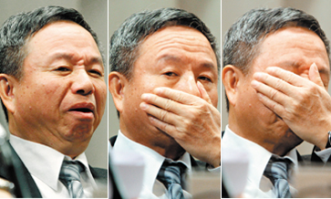 楊志良出席記者會時顯得有些疲倦,不時強忍哈欠,并用力的以手抹臉提神。 來源:臺灣《聯合晚報》