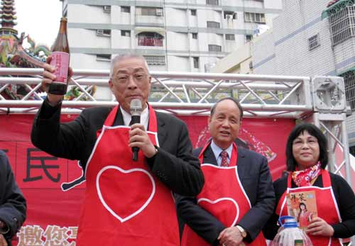 此外,吳敦義認真料理之余,不忘為臺灣煙酒公司生產的料理米酒打廣告,逗得現場民眾笑得合不攏嘴。