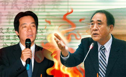 因建設工程款爭議,臺南市政府與議會對立。市長賴清德(左)表示議員要工程款,越權造成浪費。市議員吳健保(右)則表示,市長如此說法,無異是向議員開戰(zhàn)。圖片來源:臺灣《聯(lián)合報》