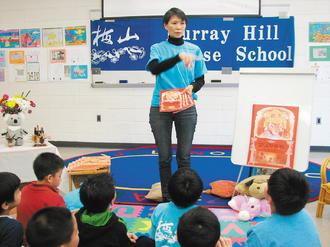周美青為紐澤西梅山中文學校二年級孩子說故事,教他們學好中文。