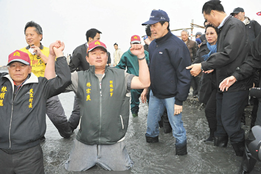 中國臺灣網(wǎng)4月5日消息 據(jù)臺灣《聯(lián)合報(bào)》報(bào)道,臺灣地區(qū)領(lǐng)導(dǎo)人馬英九與臺當(dāng)局“內(nèi)政部長”江宜樺等人,4日由彰化縣環(huán)保聯(lián)盟成員帶領(lǐng),坐著采蚵車前往大城濕地巡視;海灘前,一群反“國光石化”的民眾舉起“濕地石化無法并存”、“國光石化撤案,濕地才有未來”的布條,甚至有人跪在海灘中,向馬英九宣示保護(hù)濕地的決心。
