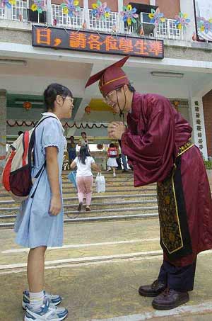 據臺灣《中國時報》報道,臺北市開學首日志清小學校長穿著古代夫子裝,站在校門口,迎接小朋友到校上課。圖為身穿古裝的校長正跟小朋友打躬作揖,模樣非常逗趣。