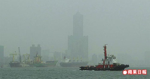 沙塵暴襲臺,從高雄港海面上望去,原本可清楚看到輪廓的高雄市標(biāo)志性建筑85大樓宛如海市蜃樓。 來源:臺灣《蘋果日報》
