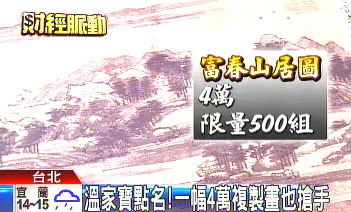 溫家寶總理提過分藏兩地的《富春山居圖》復(fù)制版一幅賣4萬元新臺(tái)幣,依然熱銷。 來源:臺(tái)灣TVBS電視臺(tái)