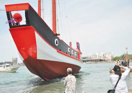 仿鄭成功時期戰船打造的“臺灣船”昨天在臺南市安平港下水,市民搶著拍照,見證歷史一刻。圖片來源:臺灣《聯合報》