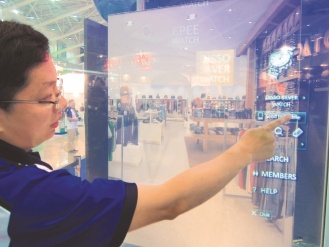 英特爾展示大型觸控廣告牌,讓現實生活更接近科幻片。圖片來源:《聯合報》