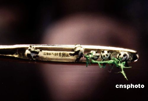 透過放大鏡,記者才得以窺見陳逢顯新作的無窮奧妙。國寶大熊貓是一件與二○○八北京奧運(yùn)有關(guān)的作品:用樹脂微雕成的五只平均尺寸只有零點(diǎn)七毫米的大熊貓,黑白相間、憨態(tài)可掬。它們或在爭吃細(xì)嫩、翠綠的竹子,或在玩耍展示刻有“二○○八北京奧運(yùn)”字樣的橫幅。這一住在針孔中的大熊貓家族被陳逢顯刻畫得活靈活現(xiàn)。陳逢顯笑稱,三只正在吃竹子的小大熊貓還叫著“長大也要參加奧運(yùn)”呢。他說,這是他用了六個(gè)月的時(shí)間才完成的作品。