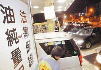 臺(tái)灣傳出加油站賣假油,一家加油站特意打出“法律保證、油純量足”,讓顧客安心。(聯(lián)合報(bào)圖)