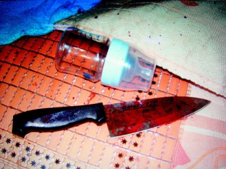 簡姓婦人殺死4個月大兒子的兇刀,血跡斑斑,兇刀旁還留有兒子用的奶瓶。圖片來源:臺灣《聯合報》