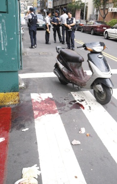 高雄火車站前昨警匪槍戰(zhàn),雙方互開20多槍。通緝犯劉傳成小腿多處中槍血肉模糊,現(xiàn)場遺留滿是血跡的摩托車。。▓D片來源:臺(tái)灣《聯(lián)合報(bào)》)