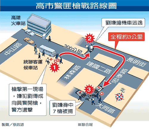 劉傳成一度中彈跌倒,馬上又爬起,邊逃邊朝警員開槍,轉(zhuǎn)入附近林森一路商店街內(nèi),看到停在路旁的摩托車鑰匙沒拔下,搶走摩托車?yán)^續(xù)逃。警察連開好幾槍,他仍負(fù)傷逃逸,警察隨即以無線電通報(bào)警網(wǎng)圍捕。