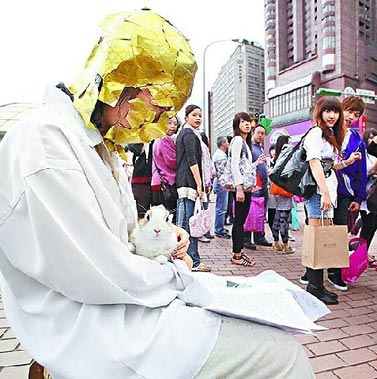 中國臺灣網10月26日消息 據臺灣《蘋果日報》報道,繼用豬血在馬路上寫字引發爭議后,臺灣藝術大學學生王思涵昨再度上演街頭行為藝術,王思涵在臉上和頭發上涂滿蜂蜜,再黏上金色紙片,懷里抱著一只小兔子,獨坐在臺北巿人行道上,很多人直呼看不懂。
