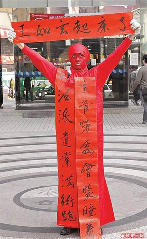 朱政騏昨早潛入“勞委會”大樓,想到各樓層貼“恭賀新禧/請關心派遣臨時工”標語春聯,卻因多數樓層大門上鎖,只能在未上鎖的十樓男廁內貼一張;隨后他全臉涂紅、身穿紅衣、頭綁紅頭巾,身掛“非法派遣業滿街跑”、“主管勞委會裝睡著”對聯,高舉“王如玄起床了”橫批,向臺“勞委會”嗆聲。