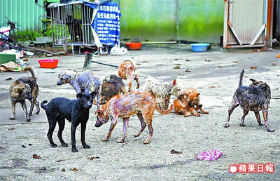 賈鴻秋狗場(chǎng)遍布狗的排泄物,場(chǎng)內(nèi)約150只狗幾乎都罹患皮膚病。 來源:臺(tái)灣《蘋果日?qǐng)?bào)》