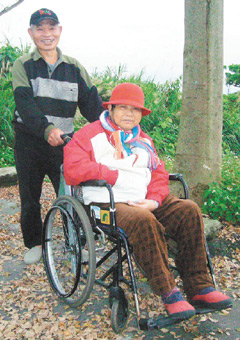 去年兒子搬出去,他獨(dú)力照顧。他說(shuō),妻子病久了,難免會(huì)發(fā)牢騷、會(huì)哭,早晨五點(diǎn)多起床,他背妻子下樓,邊哄邊做早餐,再用自制的單杠為妻子復(fù)健,吃飽吃藥后就散步去田園,“這是她最開(kāi)心的時(shí)候,我搭火車(chē)去臺(tái)東看小女兒,也帶妻子去。”