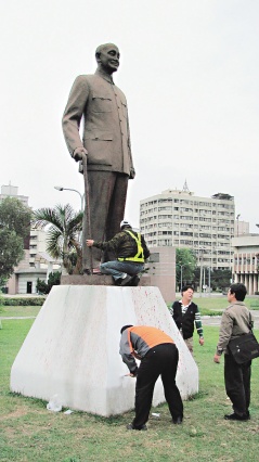 臺中市學(xué)士路中正公園內(nèi)的蔣介石銅像,昨天凌晨被不明人士潑灑紅漆。