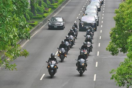 圖為“憨面”移靈車隊由12輛哈雷前導,后面跟著30多輛雙B(奔馳、寶馬)。 圖片來源:臺灣《中國時報》
