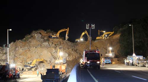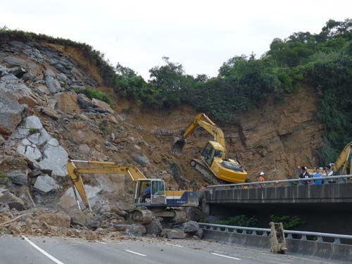 臺灣3號高速公路昨天嚴重走山,在崩塌處北邊工程單位派出多架挖土機連夜搶救。(圖:《聯合報》)