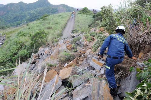 臺灣3號高速公路3.1公里處昨天下午發生嚴重山崩意外,基隆巿長張通榮(前者)昨天抵達現場后,面色凝重。(圖:《聯合報》)