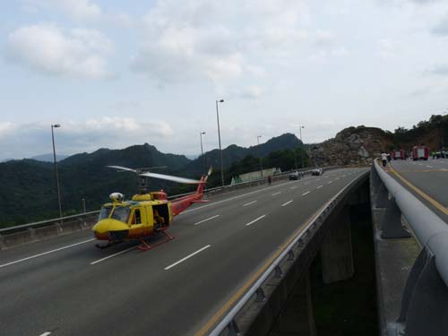 臺當局“消防署”空消直升機昨天罕見地停在因走山而中斷的臺灣3號高速公路上。(圖:《聯合報》)