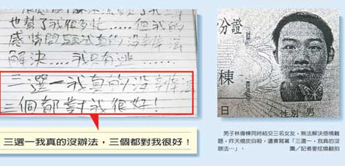 中國臺灣網6月19日消息 據臺灣《聯合報》報道,“3選1,我真的沒辦法,3個都對我很好…”同時結交3名女友的男子林偉棟,因為沒有辦法“3選1”,昨被發現在臺北市租屋處燒炭自殺,并留下遺書。臺北警方研判他因為4角戀解不開而尋短。